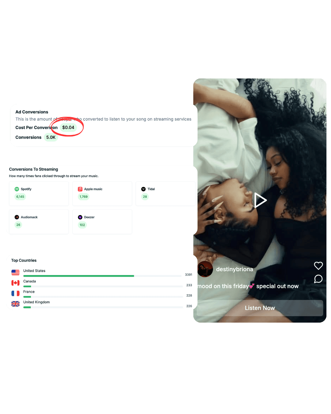 Paired with massive discovery on socials, Destiny used NextGen’s Streaming Growth Playbook to run automated ads that directed targeted listeners straight to her singles on Spotify and Apple Music + more.
